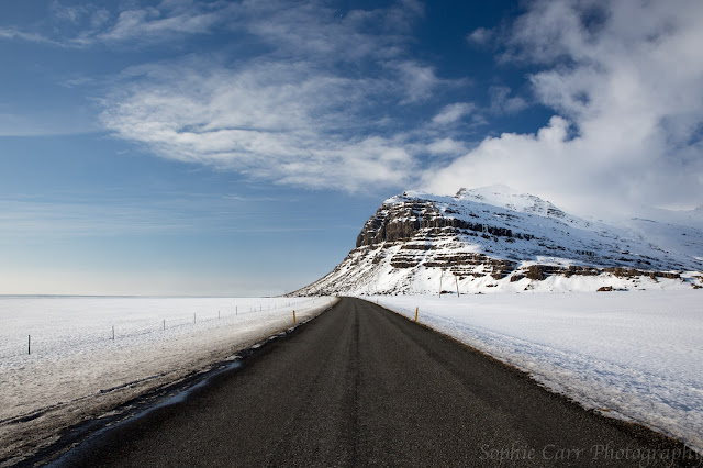 I stop at a couple of the same places on each trip now - the line of the trees, the favourite tree, the windy road past the tunnel, the cottage at Stafafell - but today the views were so stunning that I seemed to be pulling over every few kilometres. The snow-covered mountains above the stark black roads disappearing into the distance were just mesmerising. I had plenty of time (didn't have to check in at the Bragdavellir cottage until 4pm), and not all that far to drive, so it didn't matter how many stops I made. There were lots.