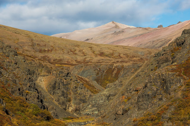 I'd read someone's trip report saying that the walk back from the canyon wasn't very interesting, so I was prepared for another 7km or so without much to photograph. The person was wrong; it was a lovely walk! Almost immediately I saw summer houses nestled at the foot of hills, the braids of the river reaching out ahead of me, autumnal trees everywhere. It was a long walk, and being along a gravel road made it a little less interesting than across hillsides of moss and shrubs, but the views were still spectacular. There were lots of different rock formations along the way.